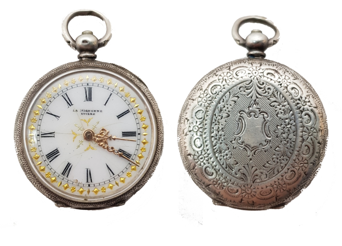 ENGLISH MADE IN 925 SILVER CASE, PEN CRAFTED POCKET WATCH. BACK KEY WAS INSTALLED AND IS IN WORKING CONDITION. THE YELLOW DOTS ON THE DIAL ARE GOLD.